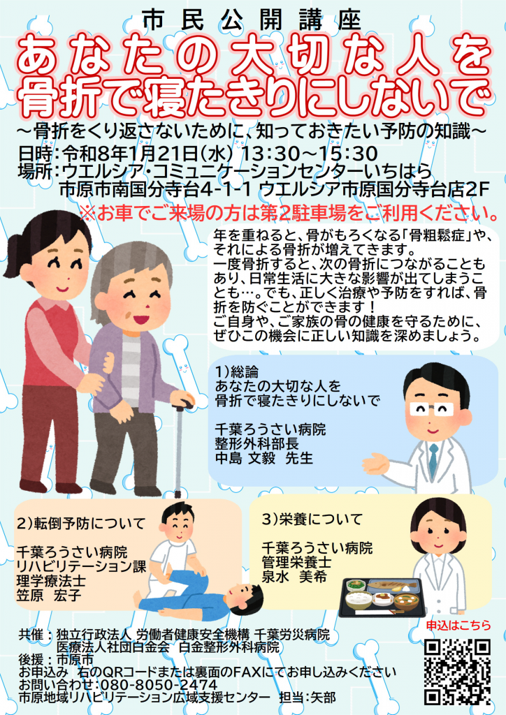 研修会のお知らせ:あなたの大切な人を骨折で寝たきりにしないで お知らせ 2026.01.05 1/21(水) 13:30 ウエルシアコミュニケーションセンターいちはら ※お車でお越しの方は第2駐車場をご利用ください。 あなたの大切な人を骨折で寝たきりにしないでダウンロード 参加申し込み